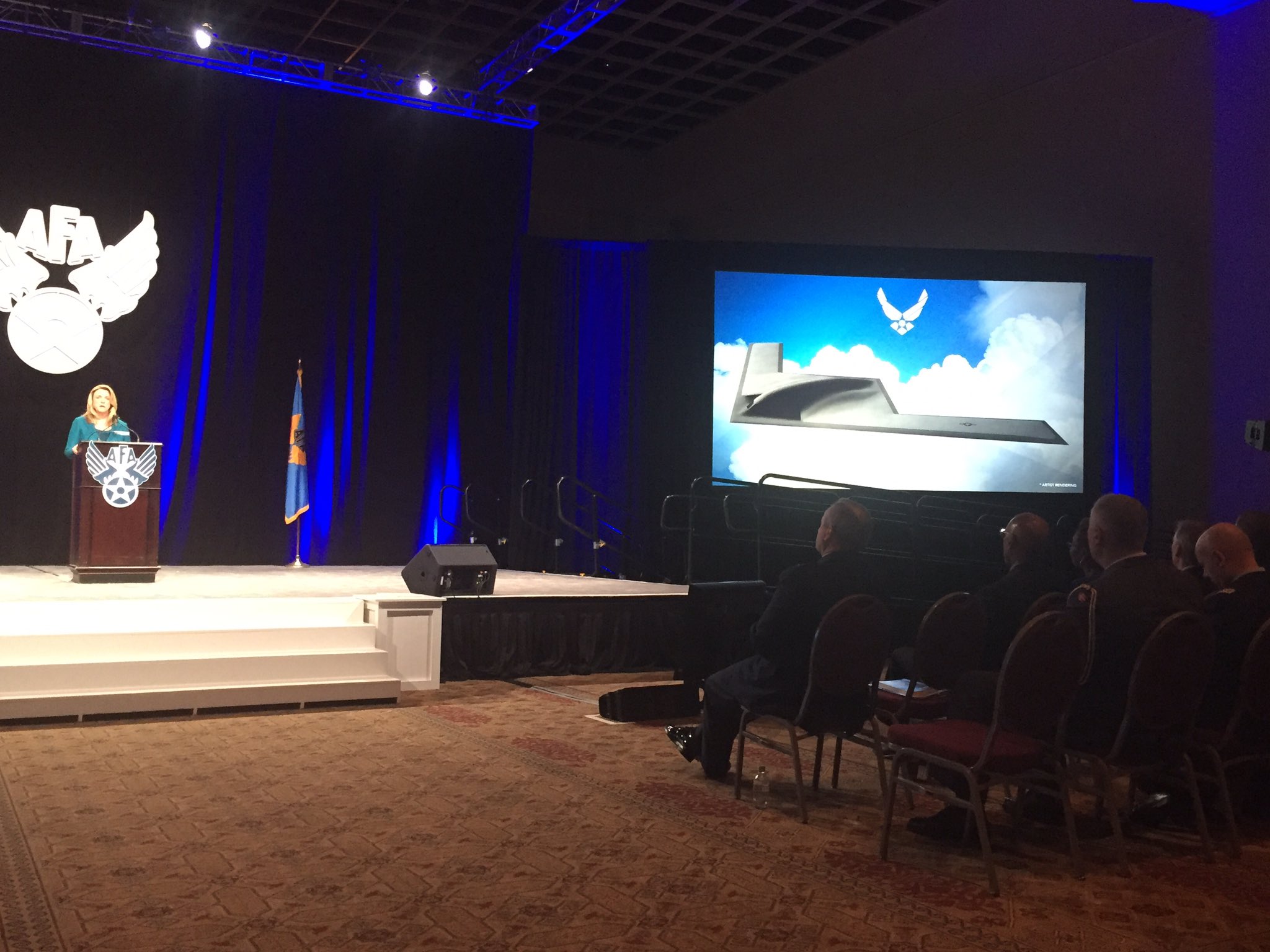 Изображение перспективного американского стратегического бомбардировщика впервые продемонстрировала глава управления военно-воздушных сил Минобороны США Дебора Джеймс, сообщает Reuters.