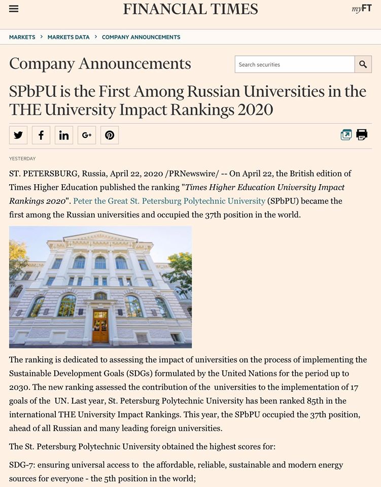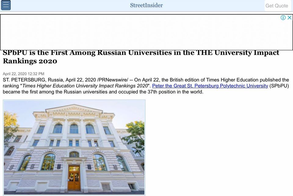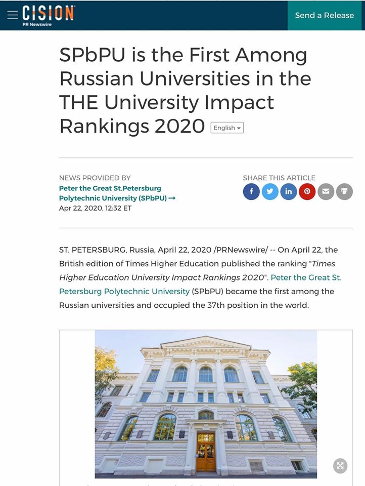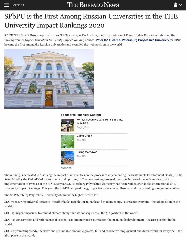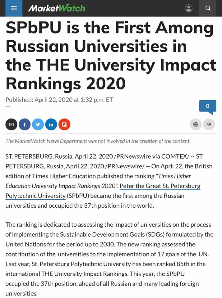 То, что СПбПУ занял 37-место в глобальном рейтинге The Times Higher Education University Impact Rankings 2020 отметили не только в России. Это событие заметили такие издания, как FINANCIAL TIMES, Wallstreet:online, MORNINGSTAR, Daily Herald, MarketWatch, Yahoo! Finance, The Buffalo News, StreetInsider, FinanzNachricten.de и другие известные зарубежные издания: