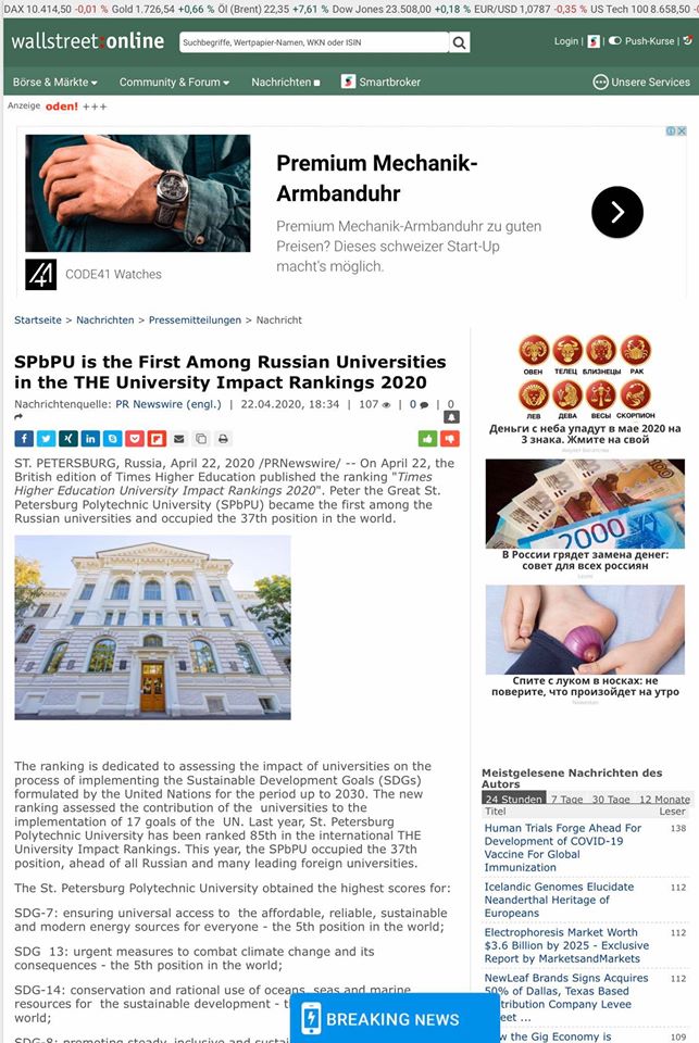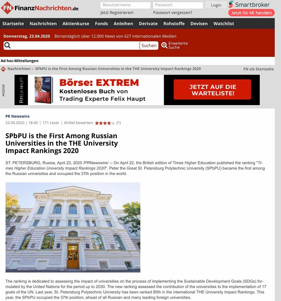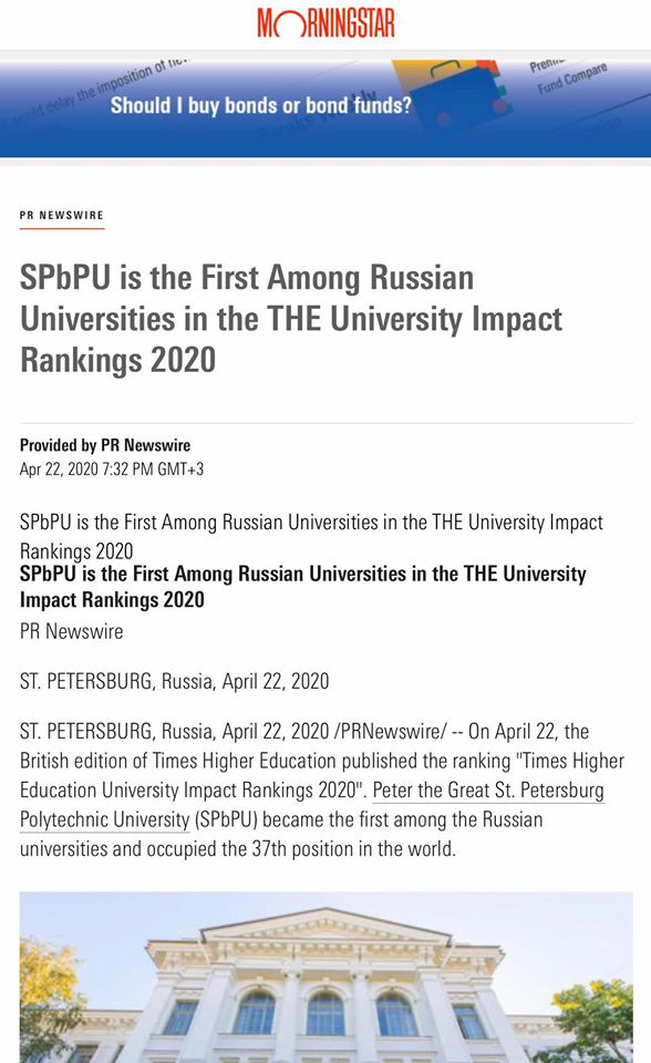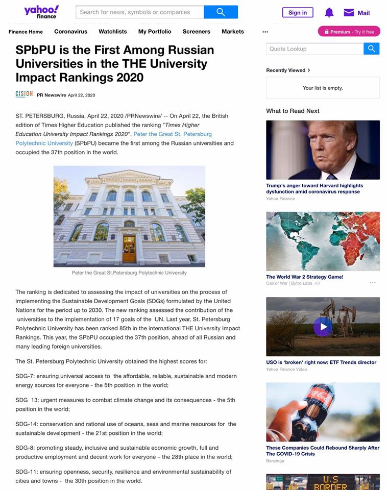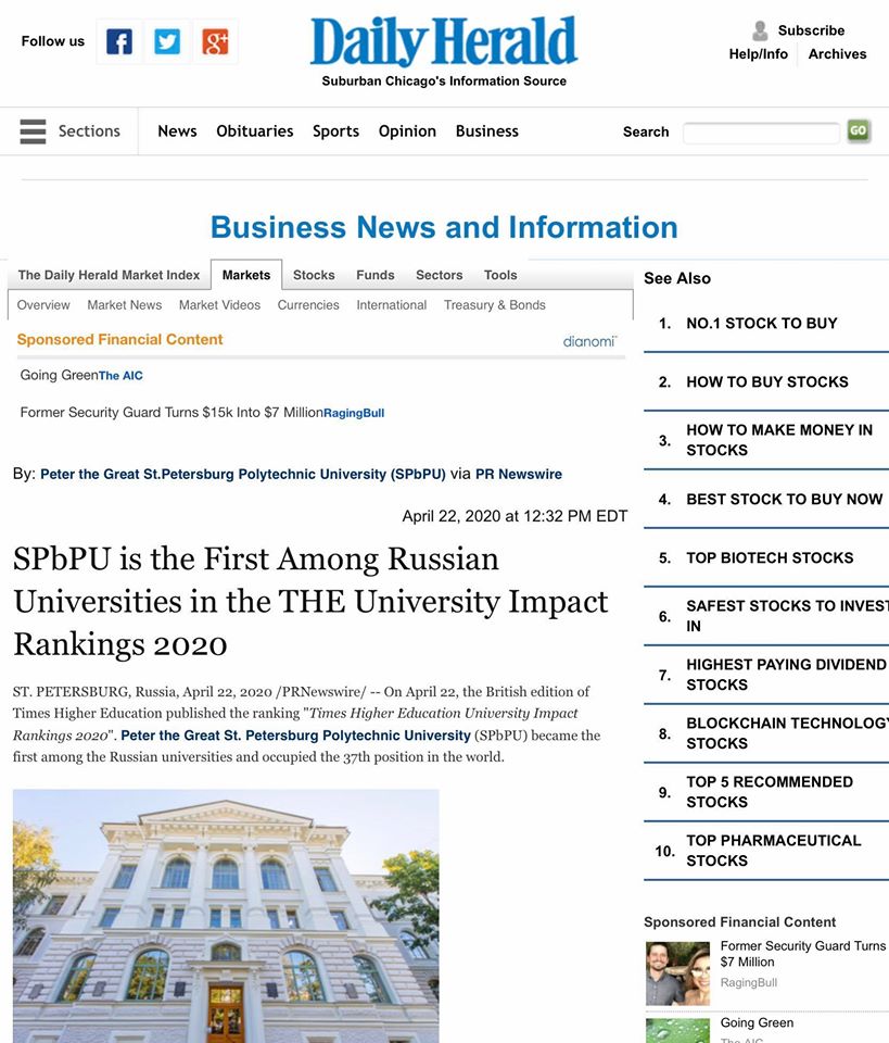 То, что СПбПУ занял 37-место в глобальном рейтинге The Times Higher Education University Impact Rankings 2020 отметили не только в России. Это событие заметили такие издания, как FINANCIAL TIMES, Wallstreet:online, MORNINGSTAR, Daily Herald, MarketWatch, Yahoo! Finance, The Buffalo News, StreetInsider, FinanzNachricten.de и другие известные зарубежные издания: