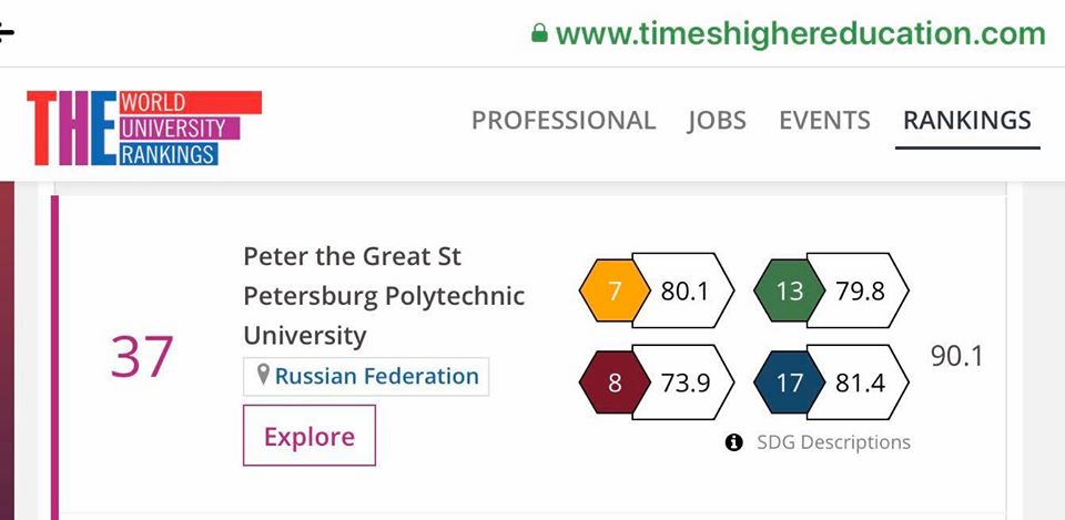 22 апреля 2020 года британское издание Times Higher Education, специализирующееся на освещении актуальных вопросов высшего образования, опубликовало всемирный рейтинг «The Times Higher Education University Impact Rankings 2020». Согласно данным издания, СПбПУ занял 37-е место во Всемирном рейтинге TНE University Impact Rankings 2020 и стал первым среди российских вузов.